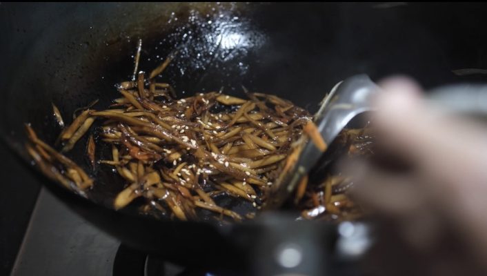 5. 加入金平牛蒡醬,並大火炒至醬料收乾,灑點芝麻,即完成