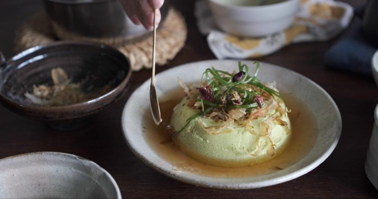 8. 最後將豆腐倒扣,淋上醬汁,撒上柴魚、蔥絲(泡軟的玫瑰花也可以撒上去),即完成!