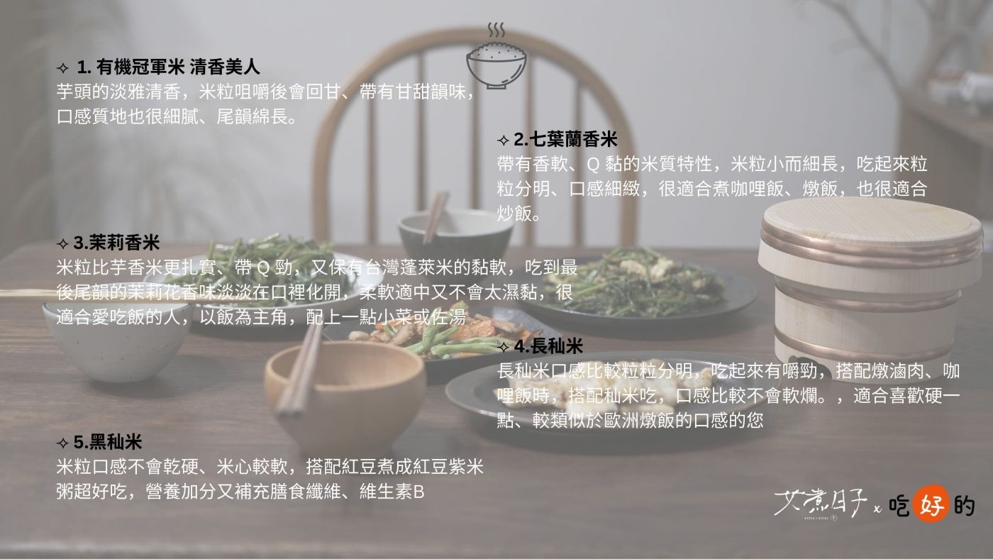 (1清香美人, 2七葉蘭香米, 3茉莉香米, 4長秈米, 5黑秈米, 下方有詳細介紹)