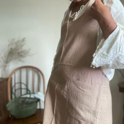 100%亞麻圍裙,質感非常輕柔,使繞脖設計沒有重量負擔。布料寬幅較寬,因此適合各種身形,也使背後看起來不會展開太多。柔美的色系,令人選擇困難,忍不住想包色,輪流替換著穿。