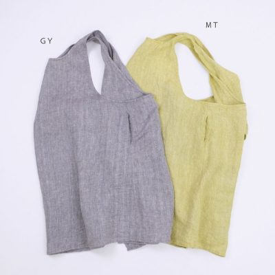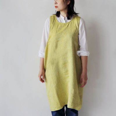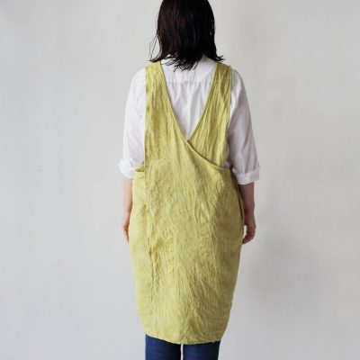 100%亞麻圍裙,細看有人字紋的圖形。此款除了特殊的免綁帶交叉設計以外,口袋像一般外出服一樣做在兩邊,非常符合人體工學。