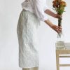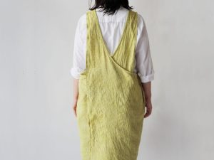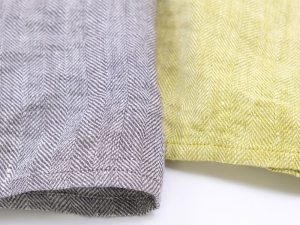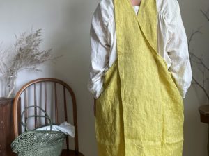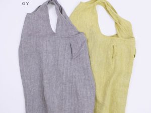 100%亞麻圍裙,細看有人字紋的圖形。此款除了特殊的免綁帶交叉設計以外,口袋像一般外出服一樣做在兩邊,非常符合人體工學。
