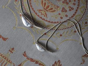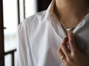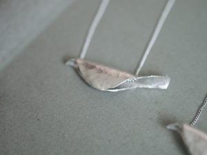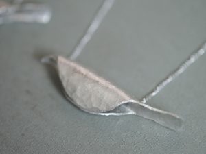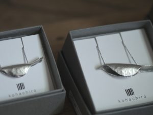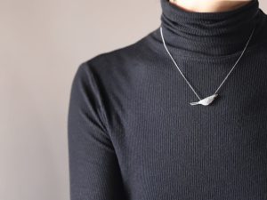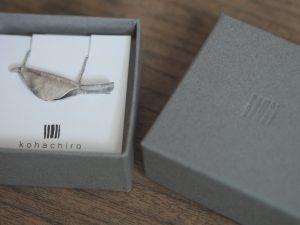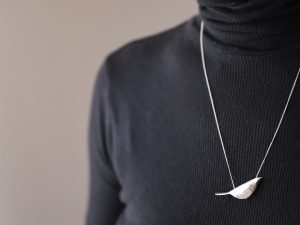 這是一款以切割並立體彎曲的錫板製作的小鳥造型項鍊。提供兩種尺寸。