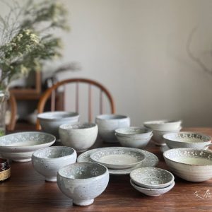 壓印的凹凸花紋手感,與自然的窯燒黑點、不均勻釉料色澤等,無一處不凸顯三島花紋器皿的溫潤陶土質地。