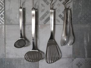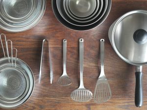此系列廚房道具為柳宗理於 1997 年的作品,簡約內斂霧面不鏽鋼質感,與手柄的柔和曲線設計,是兼具美觀與實用的廚具系列。