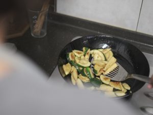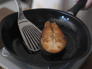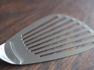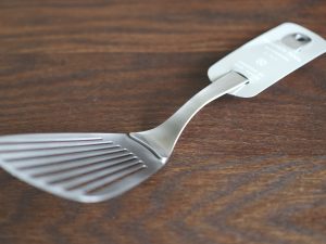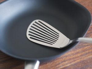 斜煎鏟前端設計略有彈性,能貼合鍋底輕易將食物鏟起翻面,也能於炒鍋簡易翻炒。