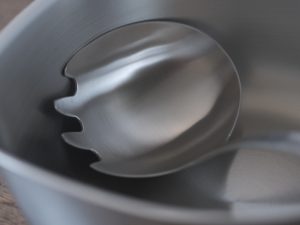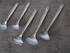 不鏽鋼湯勺為柳宗理於 1997 年的設計作品。湯勺的形狀貼合鍋邊,方便舀取食材,也方便舀湯、瀝水,同時避開食材。手柄的柔和曲線舒適地貼合您的手。由於它是一體成型的,因此耐用且易於清潔。