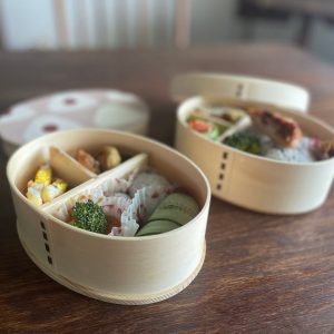 有著可愛設計的傳統曲木飯盒,由於是天然木製品,有助於調節飯盒內的水份含量,使米飯在夏季不易變質,在冬季不易變硬,能保持米飯在不失去風味的情況下食用。